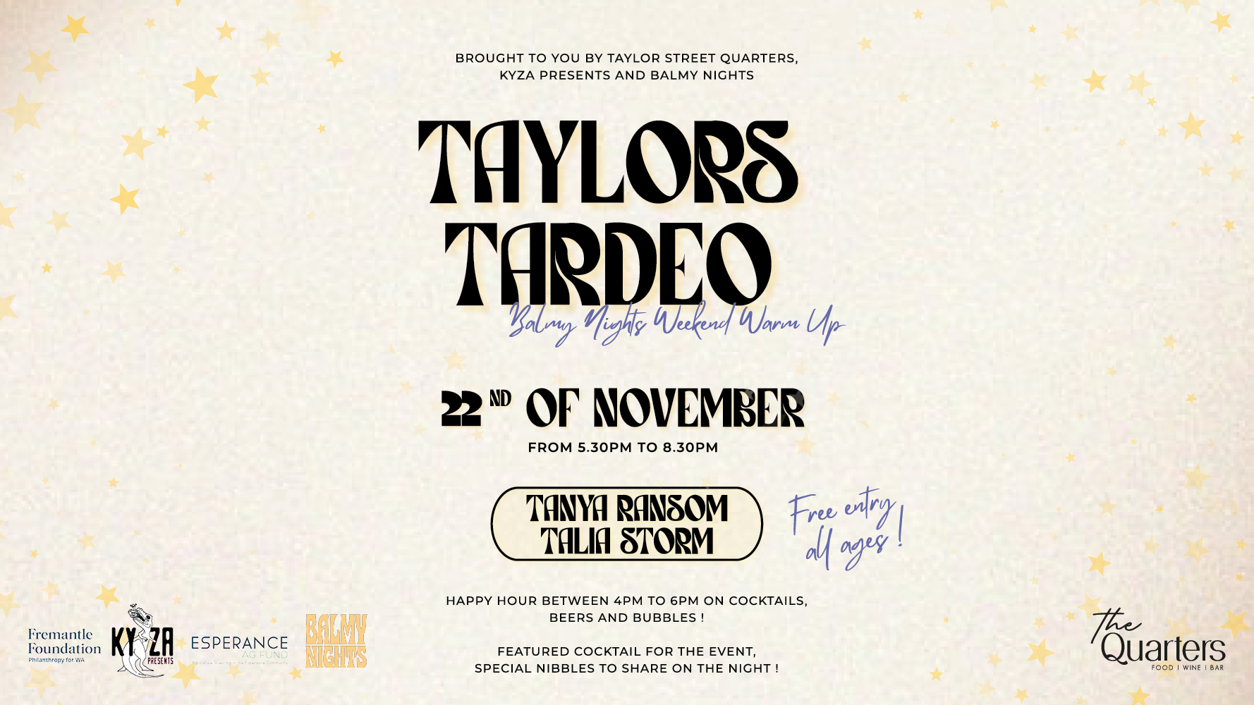 Taylor Street Quarters is a stunning location, truly reflecting the ethos and spirit of The Balmy Nights Festival. In 2024 we bring you Taylor’s Tardeo a Balmy Nights weekend warm up featuring live music performed by WA’s Best regional act 2020 Tanya Ransom with support from Esperance local Talia Storm.